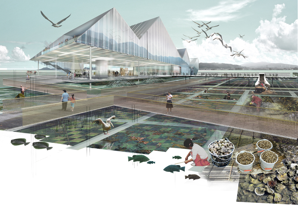 ‘Our response to pressing environmental issues, rising sea levels and growing populations together with the universal themes of the competition is to ask ‘how can man find new ways to settle along coastlines and how can he build sustainable and self-sufficient communities?’We have therefore developed the Thematic Pavilion as a prototype and catalyst for future developments. It forms the hub for a new floating network : the Amphibious Aquacultural Seascape Unit . The Pavilion will thus become a pedagogic centre and exemplar fora future ‘blue’ economy and lifestyle. The Amphibious Aquacultural Seascape Unit sits in the bay, connected to the breakwaters by a network of walkways and floating fields. This network supports a self-sufficient cycle of production of fish, food and biomass for the production of energy. This model is capable of sustaining small communities across the globe and can be deployed in areas prone to flooding. It will provide employment, energy for the pavilion and produce to feed visitors. Structurally the network is partially fixed to the seabed and partially floating.The thematic pavilion will be reached through the AASU. Visitors will have the opportunity to explore the AASU and learn at first hand about the many processes deployed forthe production of food and energy. Entry to the pavilion is via a large floating open air public piazza that serves as a market place, a night market, an event space and a venue for outdoor exhibitions.